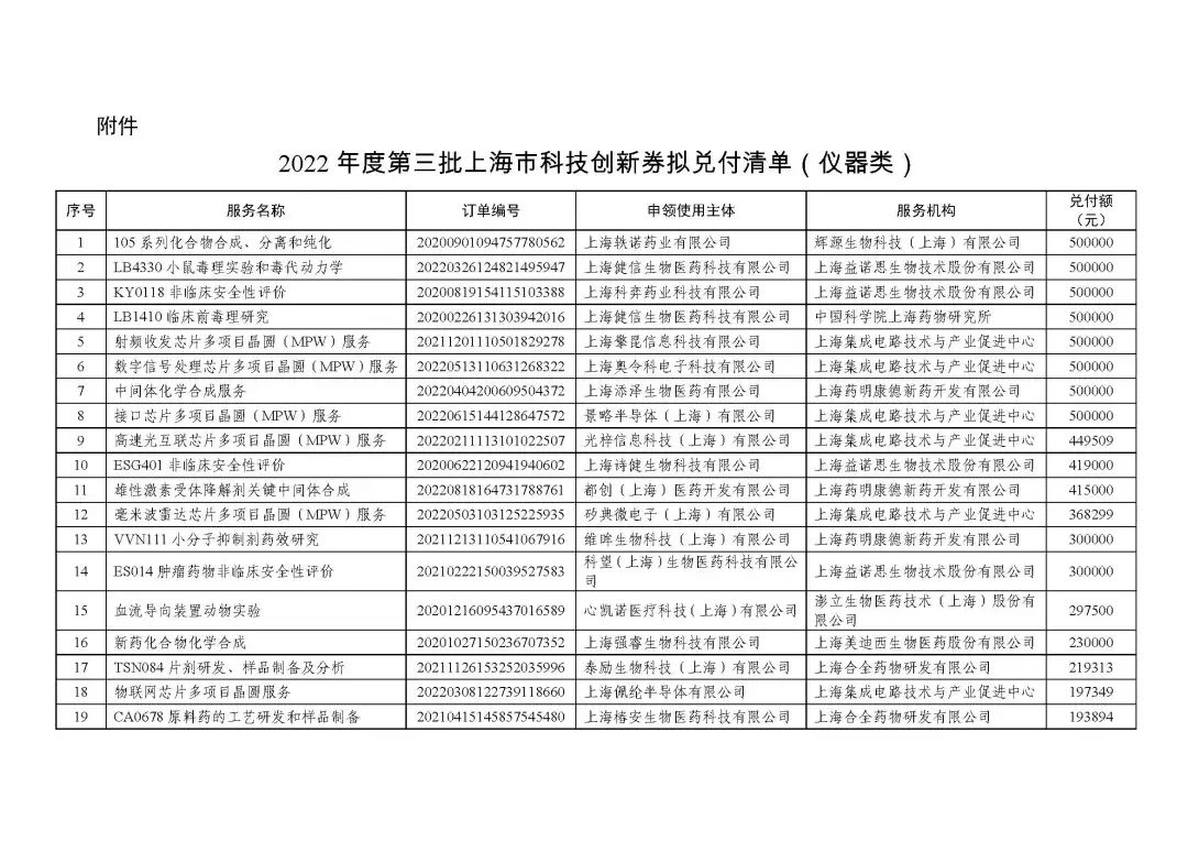 2022年度第三批上海市科技创新券拟兑付清单(仪器类)