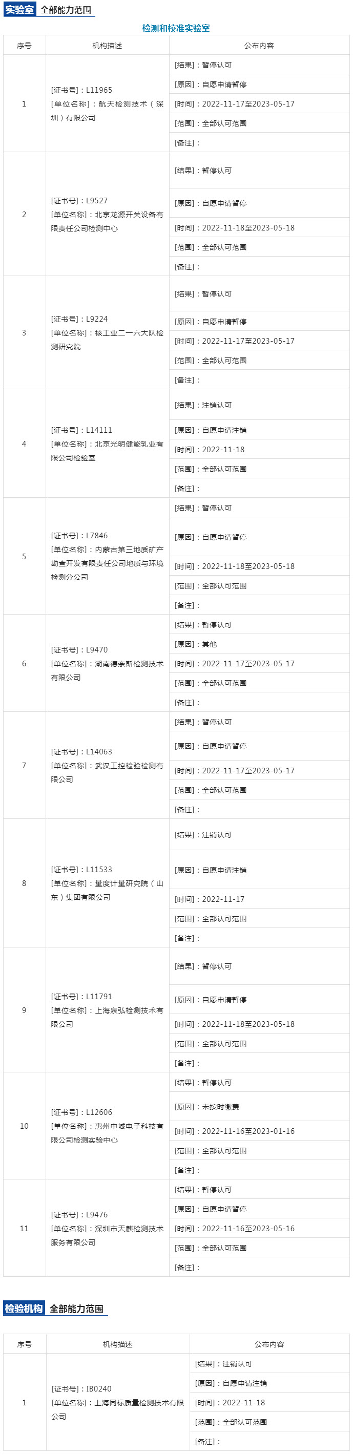 据中国合格评定国家认可委员会消息,11月下半月共计12家机构暂停/注销认可资质,其中3家机构自愿申请注销,其他9家机构为自愿申请或因未按时缴费等暂停认可。