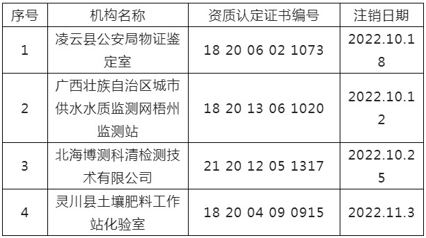 依照《中华人民共和国行政许可法》第七十条和《检验检测机构资质认定管理办法》(2015年4月9日国家质量监督检验检疫总局令第163号公布,根据2021年4月2日《国家市场监督管理总局关于废止和修改部分规章的决定》修改)第三十一条第三项的规定,根据凌云县公安局物证鉴定室、广西壮族自治区城市供水水质监测网梧州监测站、北海博测科清检测技术有限公司、灵川县土壤肥料工作站化验室等4家机构提出注销检验检测机构资质认定证书的申请,自治区市场监管局决定同意注销上述机构资质认定证书。