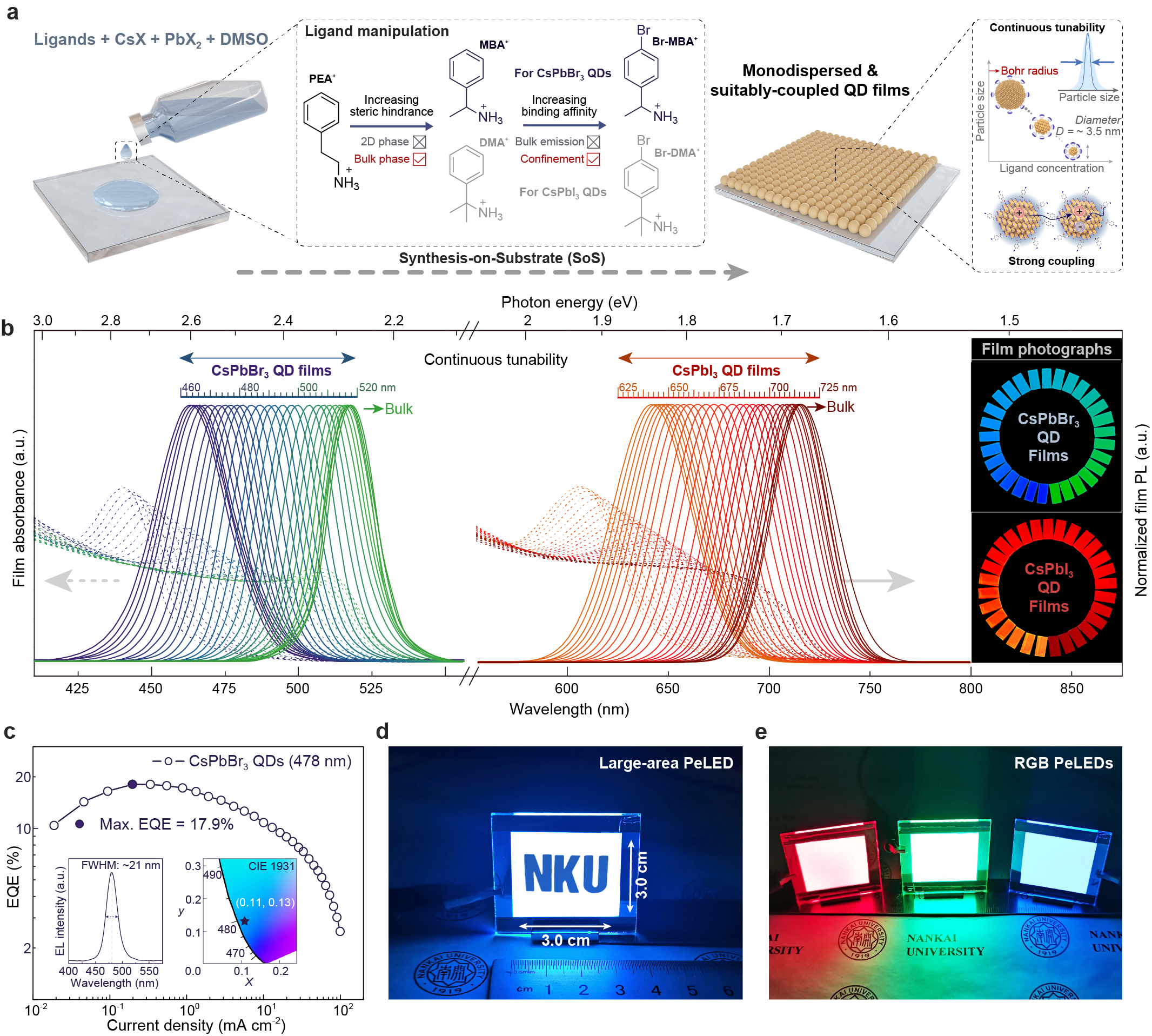 基于上述发现,研究团队随后对配体进行理性设计,创造性地实现了在基底表面上的高质量导电钙钛矿量子点固体薄膜原位合成全新策略。由于该策略可以有效避免传统量子点制备策略中所面临的配体易脱落、配体过多致使光学性能差、导电性差等问题,所合成的钙钛矿量子点固体薄膜具有极佳的光学与电学性质。同时,研究团队将该高性能钙钛矿量子点固体薄膜材料引入电致发光二极管器件中,并成功实现了具有高能量转换效率的三原色电致发光二极管的可控构筑。