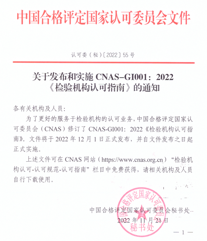 关于发布和实施CNAS-GI001:2022《检验机构认可指南》的通知