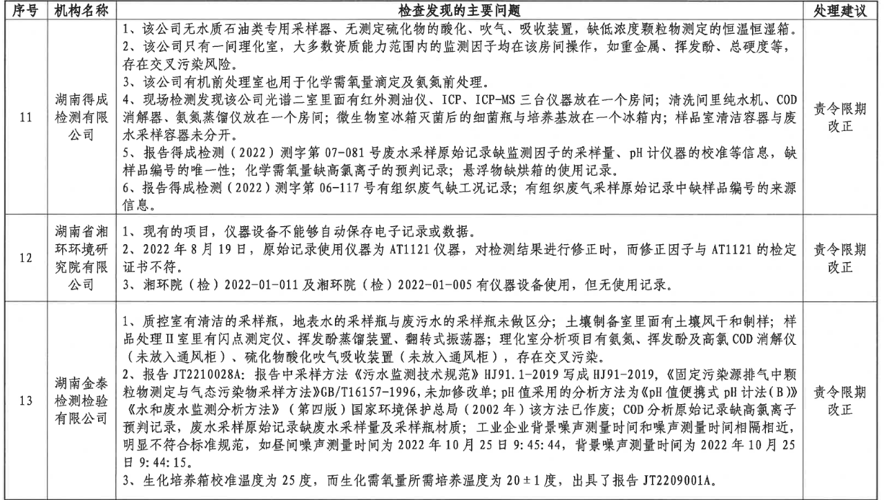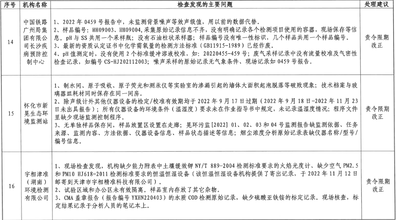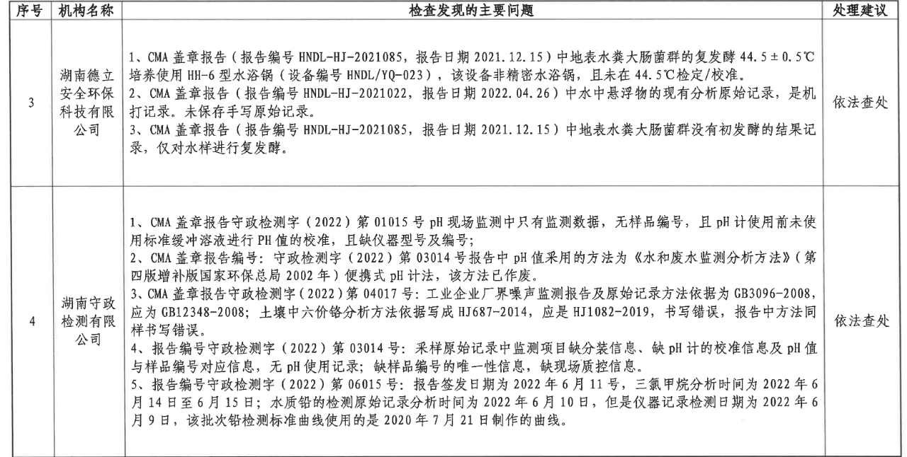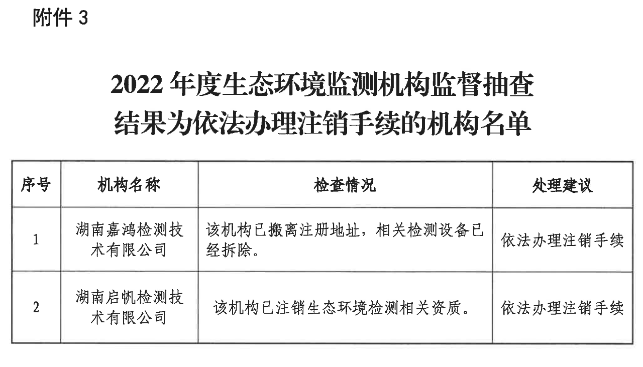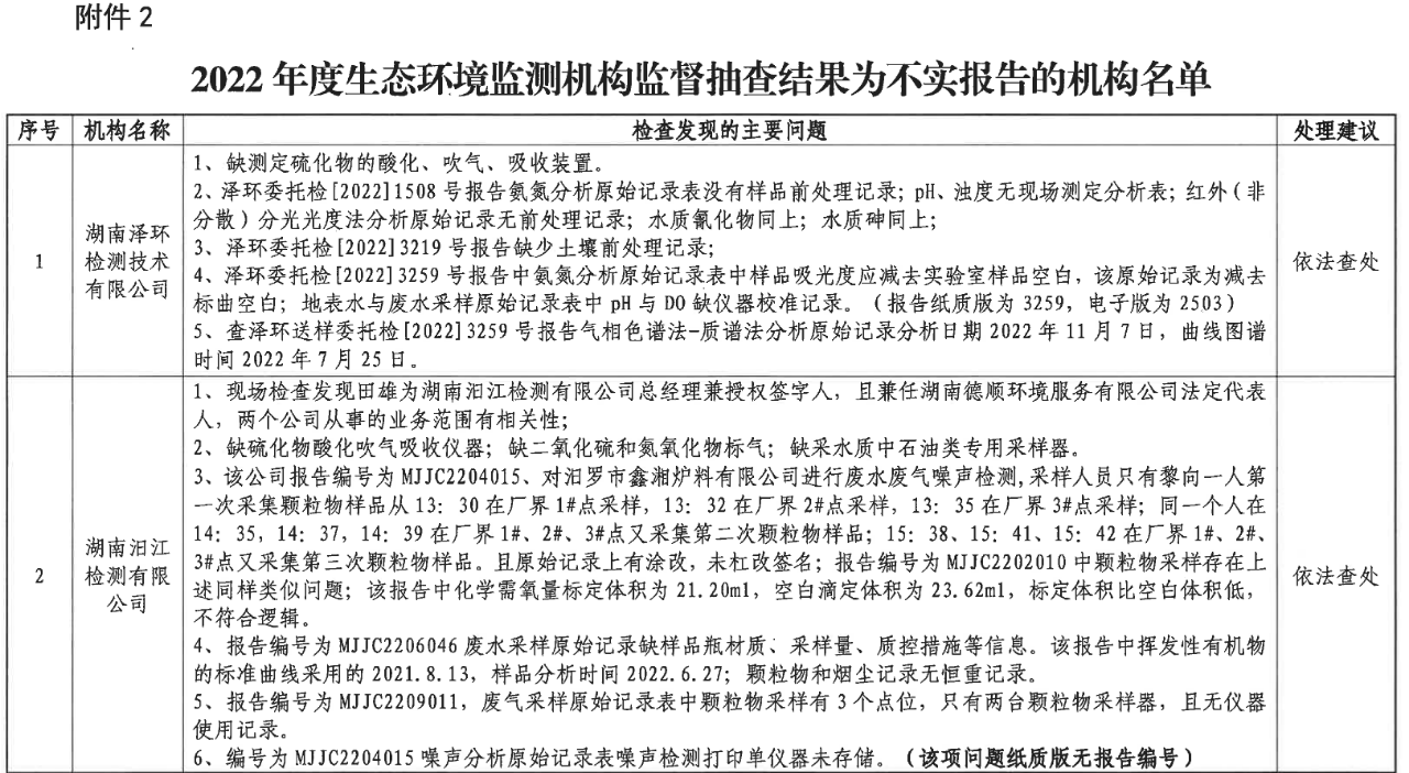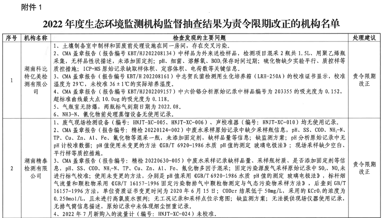 近日,湖南省生态环境厅 湖南省市场监管局对2022年度环境监测机构监督抽查情况进行了通报。通报显示,在抽查的30家环境监测机构中,其中7家机构存在未严格依据相关标准或者技术规范规定的程序和要求出具检验检测数据和结果等违规行为,列入“不实报告”的机构名单。详情如下: