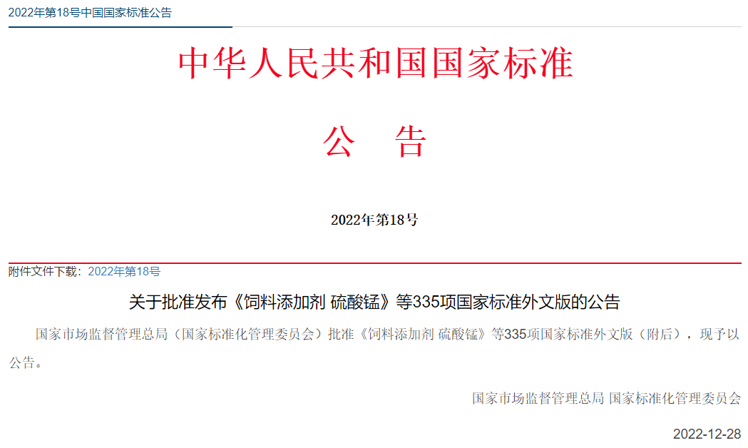 近日,《关于批准发布〈饲料添加剂 硫酸锰〉等335项国家标准外文版的公告》正式发布。具体内容如下: