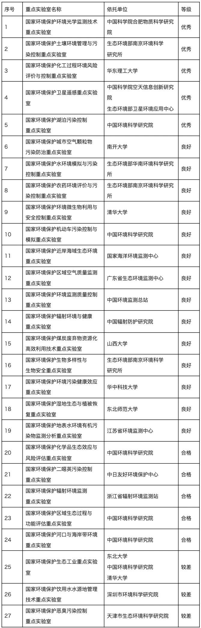 参加综合绩效评估的27个重点实验室中,环境光学监测技术等5个重点实验室评估结果为“优秀”,城市空气颗粒物污染防治等14个重点实验室评估结果为“良好”,化学品生态效应与风险评估等5个重点实验室评估结果为“合格”,生态工业等3个重点实验室评估结果为“较差”(详见附件)。优化整合饮用水水源地管理技术重点实验室和饮用水水源地保护重点实验室,不再保留饮用水水源地管理技术重点实验室。对生态工业重点实验室(介绍见文末)和恶臭污染控制重点实验室给予“黄牌警告”,请依托单位按照《管理办法》有关要求组织开展整改工作。