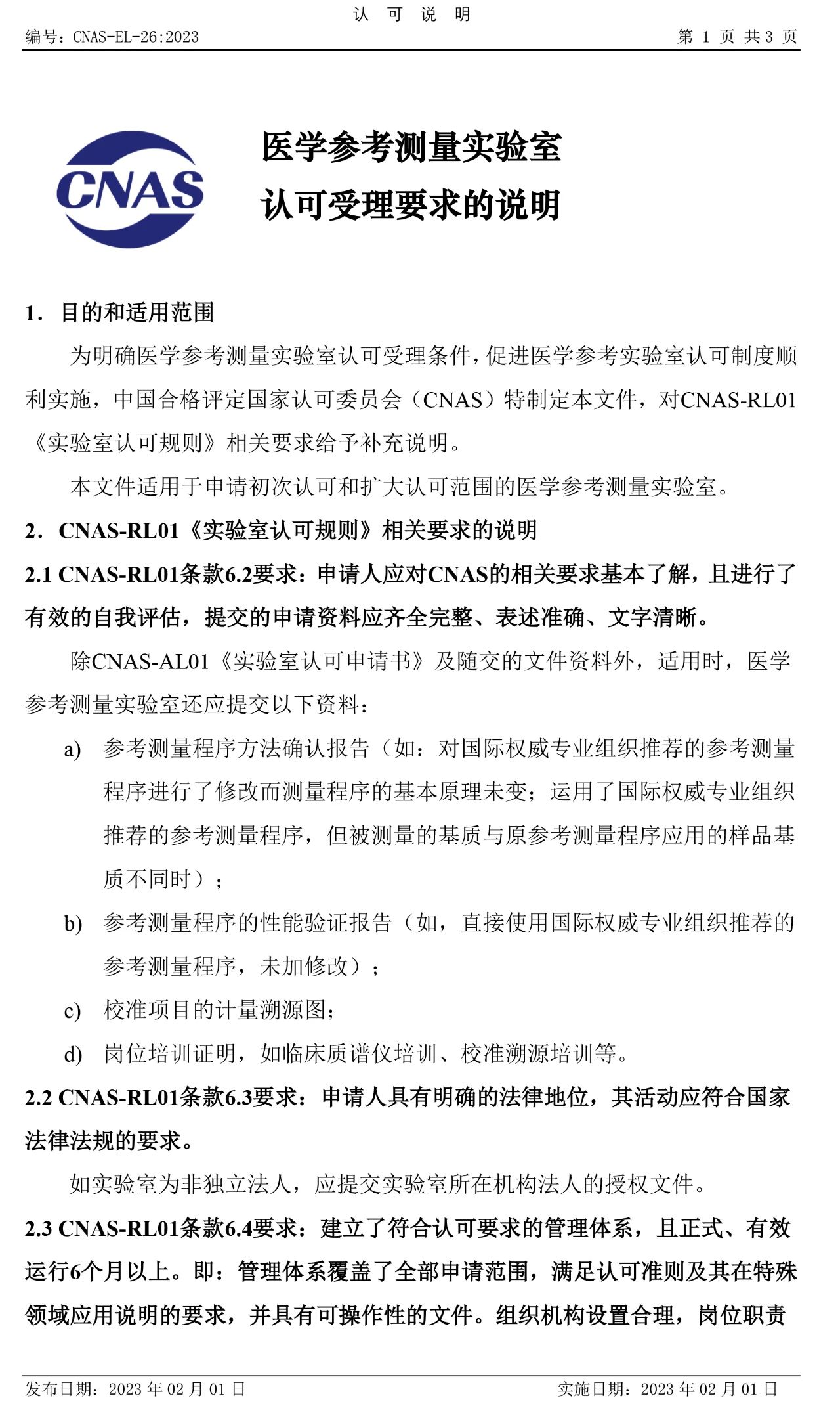 近日,中国合格评定国家认可委员会(CNAS)发布CNAS-EL-26:2023《医学参考测量实验室认可受理要求的说明》,该文件已于2023年2月1日起正式实施。详情如下:
