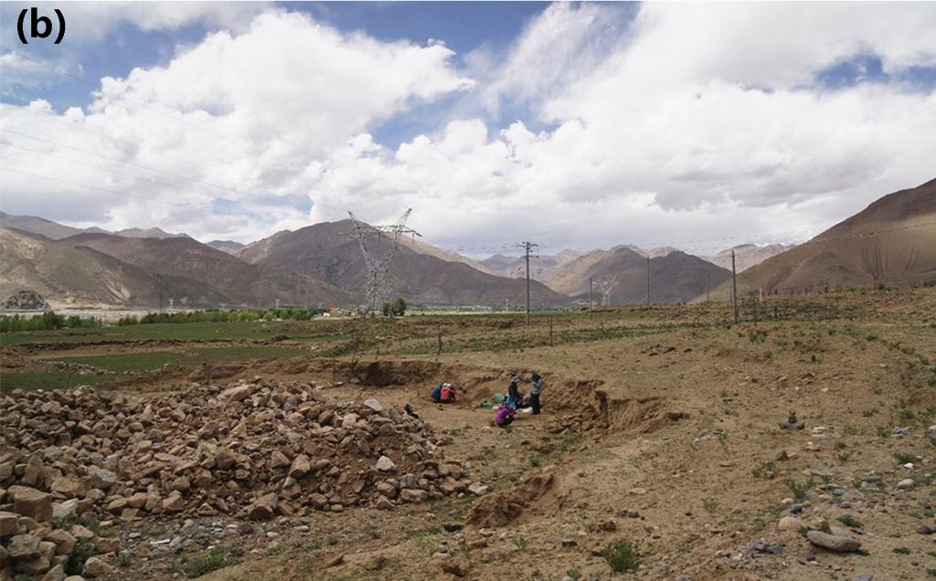 图(b)为科考队员发现共塘遗址后随即进行地层剖面清理和样品采集。(资料图片由第二次青藏科考队“人类活动历史及其影响”分队提供)