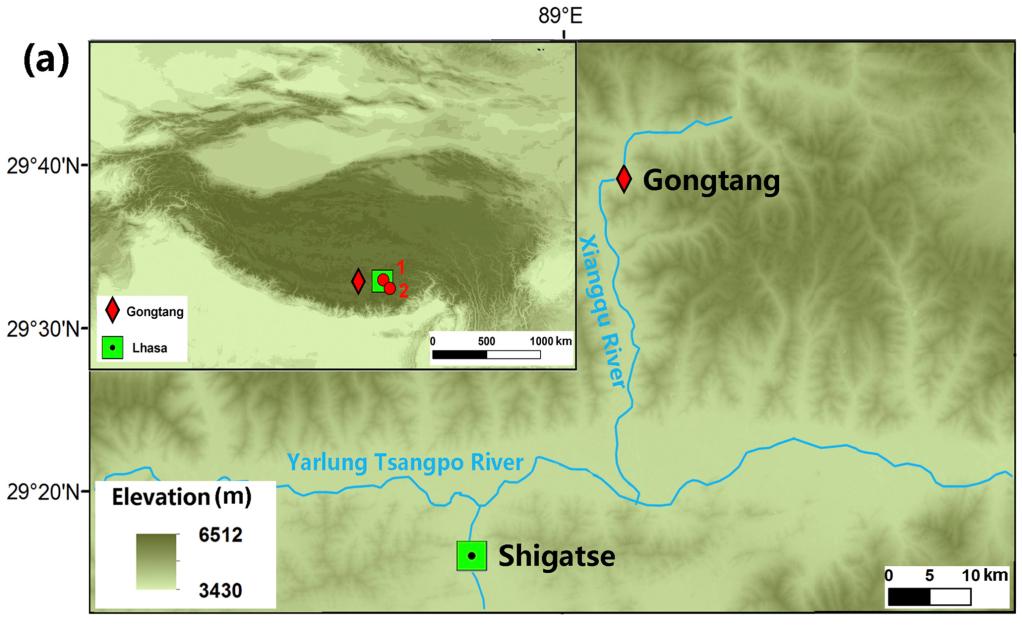 图(a)为雅鲁藏布江中游部分地区遗址背景资料图,曲贡(1)、邦嘎(2)和共塘遗址位置(红色菱形所示)。