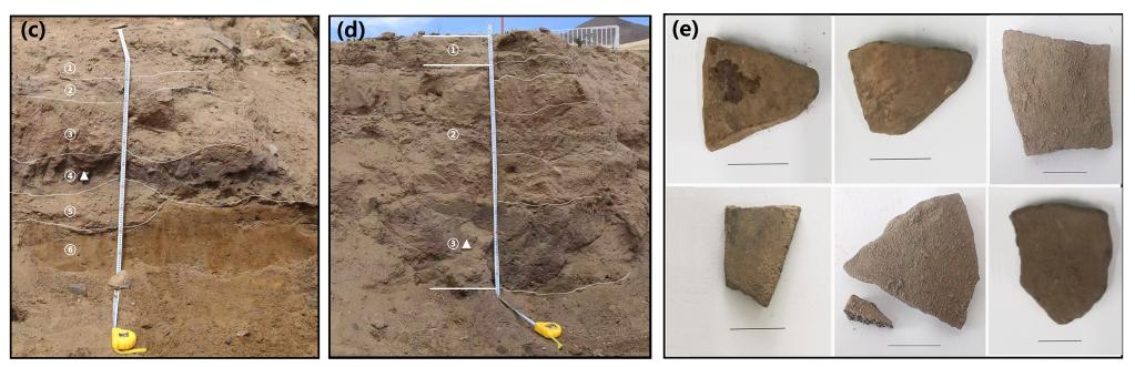图(c)(d)分别为共塘遗址调查剖面1和剖面2地层(三角形表示陶片位置)。图(e)为本研究所分析的陶片照片。