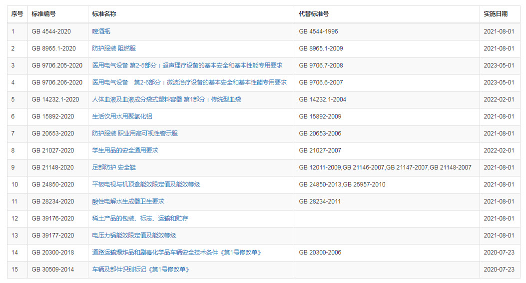 近日,国家市场监督管理总局(国家标准化管理委员会)批准发布《啤酒瓶》等13项强制性国家标准和2项强制性国家标准修改单,详情如下: