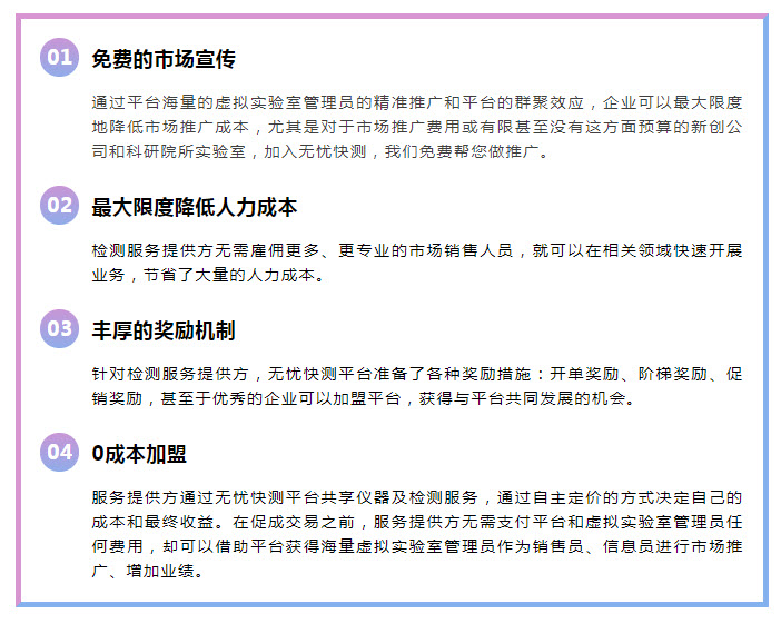 作为检验检测行业的线上服务平台,无忧快测始终致力于打造线上仪器资源共享和检测服务分享平台,为检测服务供给方和需求方搭建一座线上沟通的桥梁,足不出户即可完成信息发布、需求承接等工作,平台开发的资源共享池与虚拟云实验室将帮助第三方检测机构、实验室减少线下对接的时间成本和人员成本,低成本、高收益,助力检验检测行业实现云推广、云对接、云办公的全新运营模式。