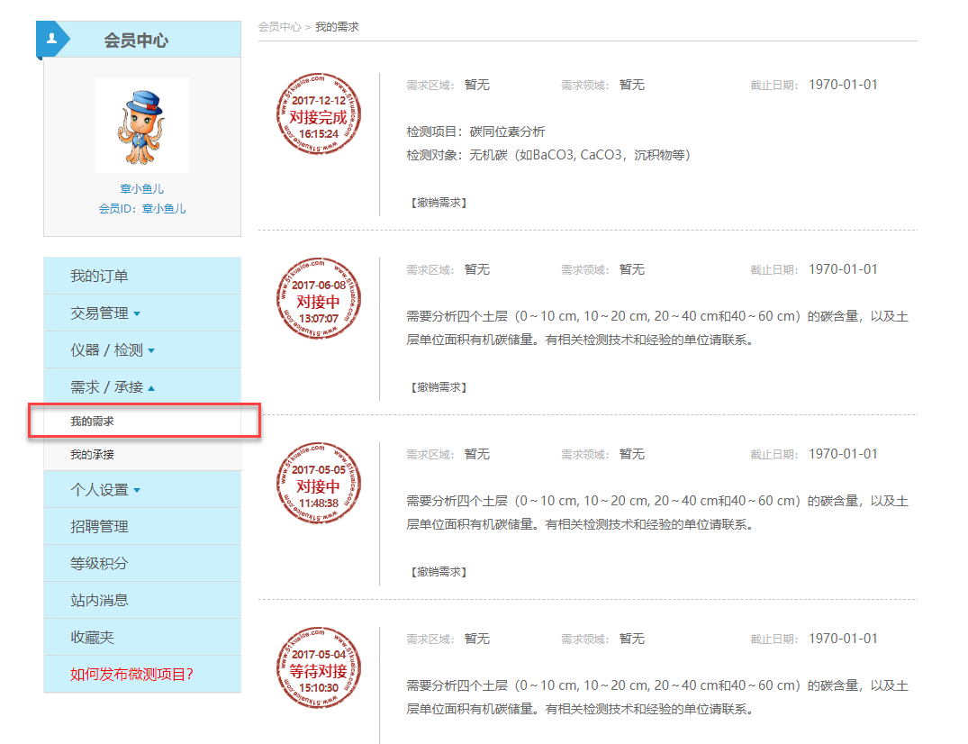 需求方发布的检测需求,可以通过会员中心的 [我的需求] 画面进行管理: