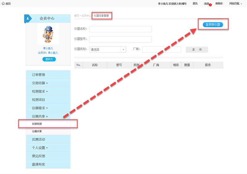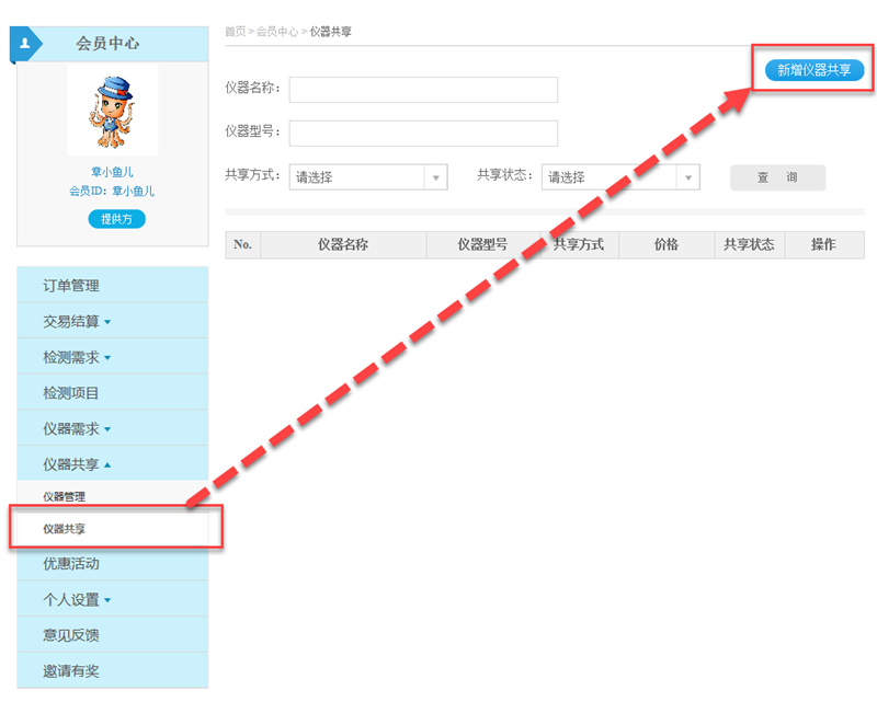 1) 在会员中心任一画面,点击左侧的 “仪器共享” 菜单,进入检仪器共享理画面并点击“新增仪器共享”按钮: