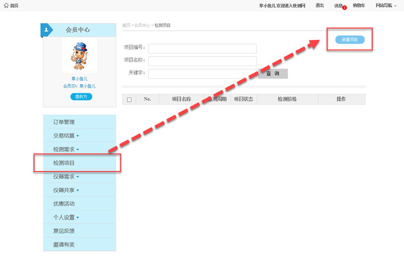 在会员中心任一画面,点击左侧的 “检测项目” 菜单,进入检测项目管理画面并点击“新建项目”按钮: