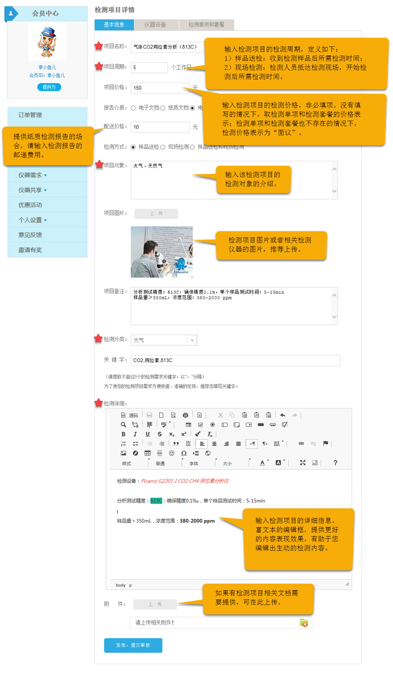 1) 检测项目基本信息的提交(红色星标处为必填项目)