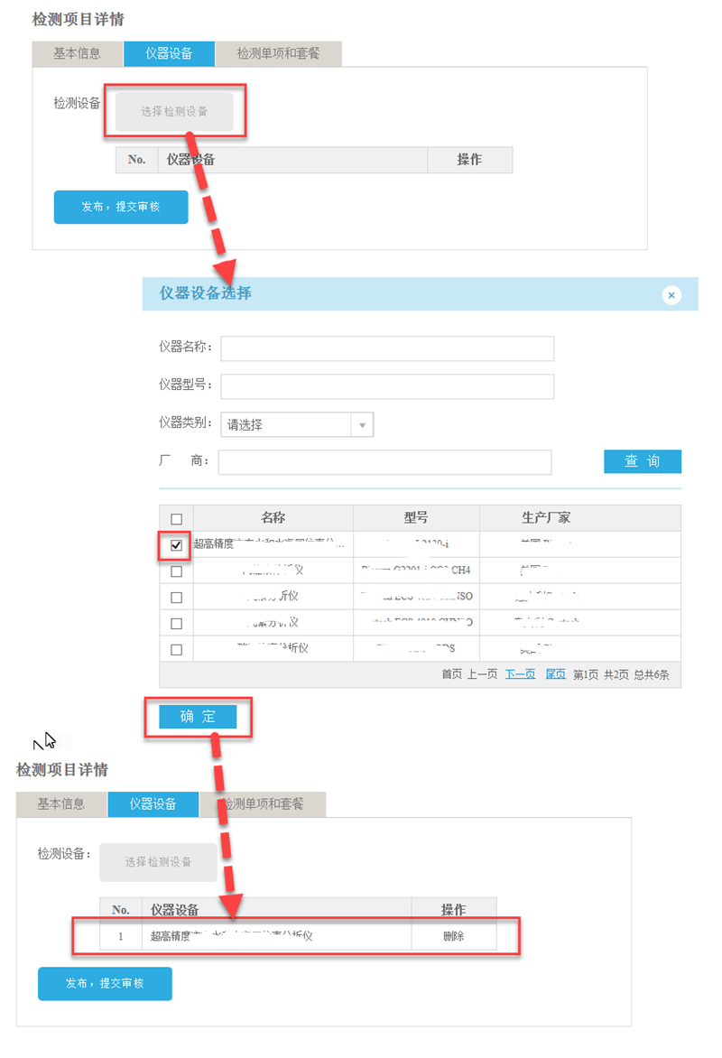 2) 检测项目使用的仪器设备信息的提交(非必须):