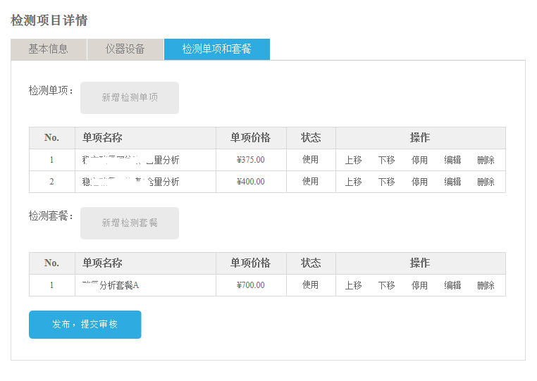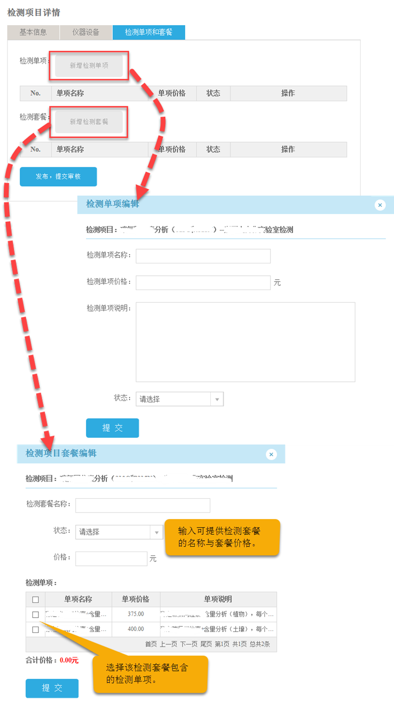 3) 检测项目的检测单项及检测套餐信息的提交(非必须):