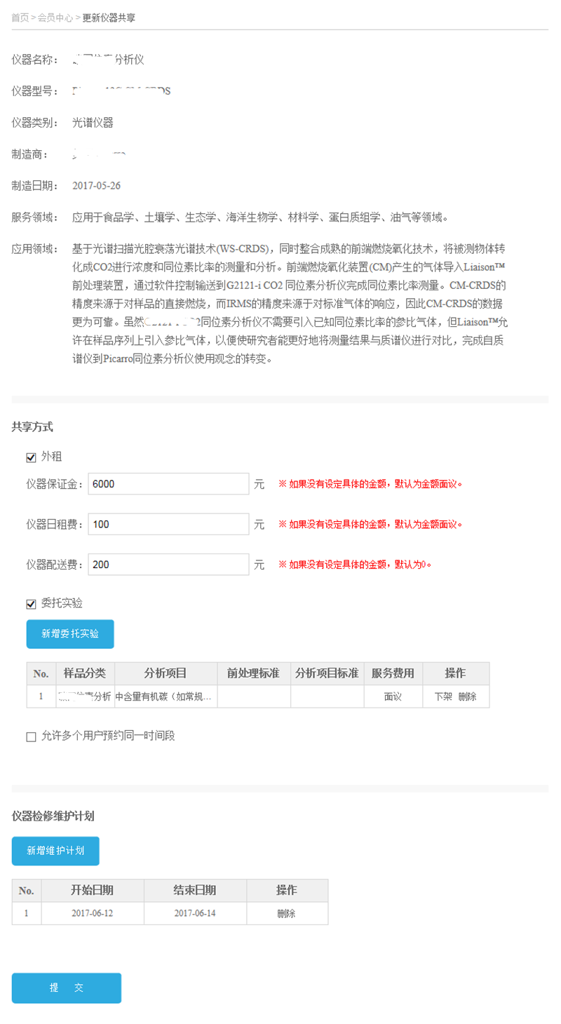 发布后的仪器共享信息在会员中心表示效果,如下图所示: |