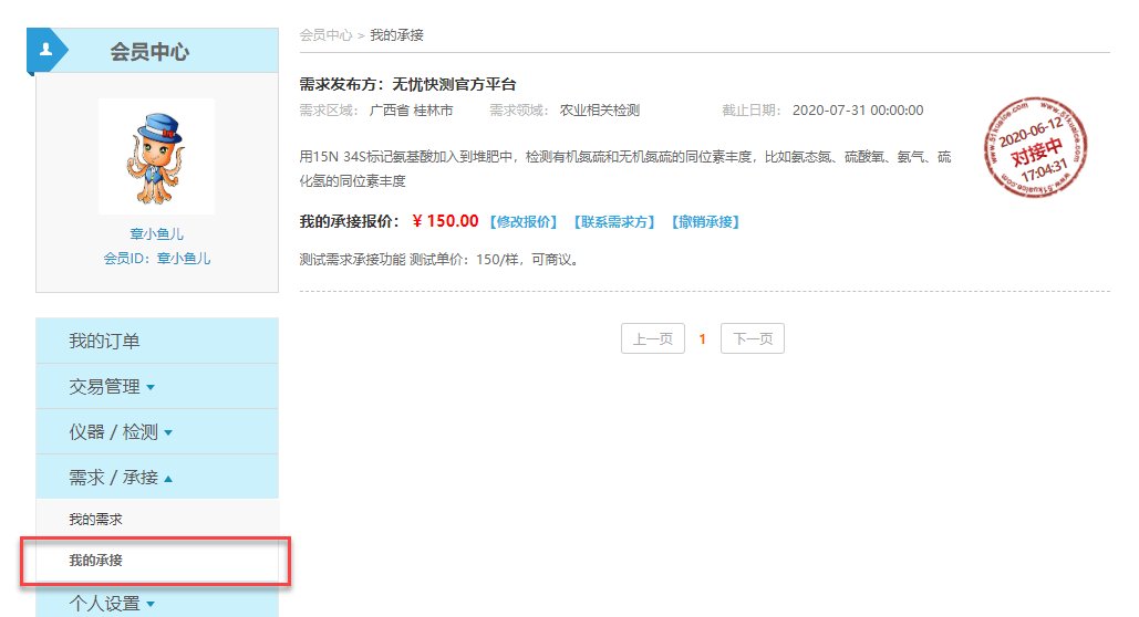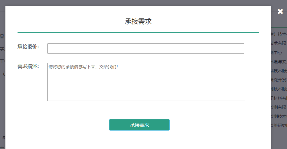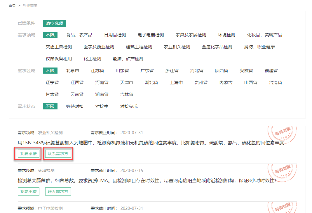 2)登陆后,在检测需求栏目画面,可以对感兴趣的需求与对方取得联系或者立即承接: