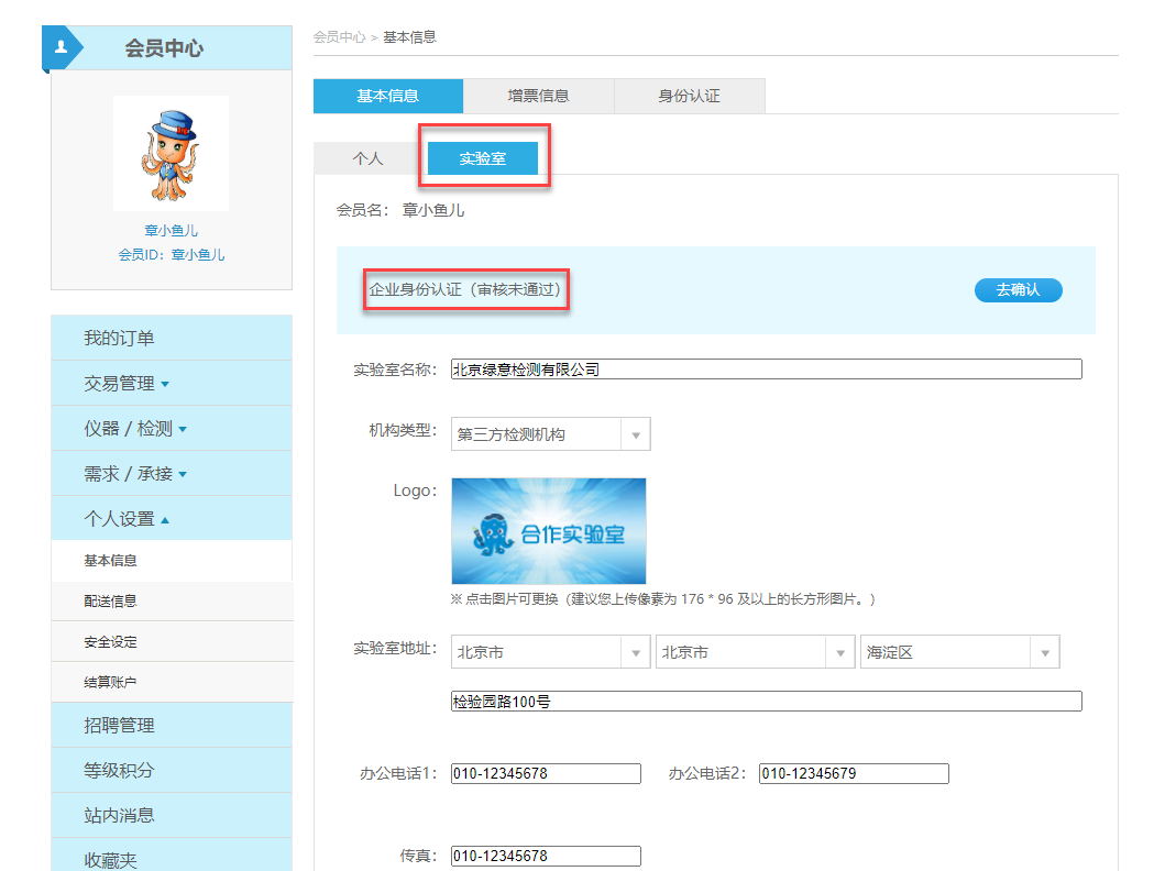 在会员基本信息的实验室信息画面,请您完善以下信息: