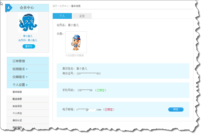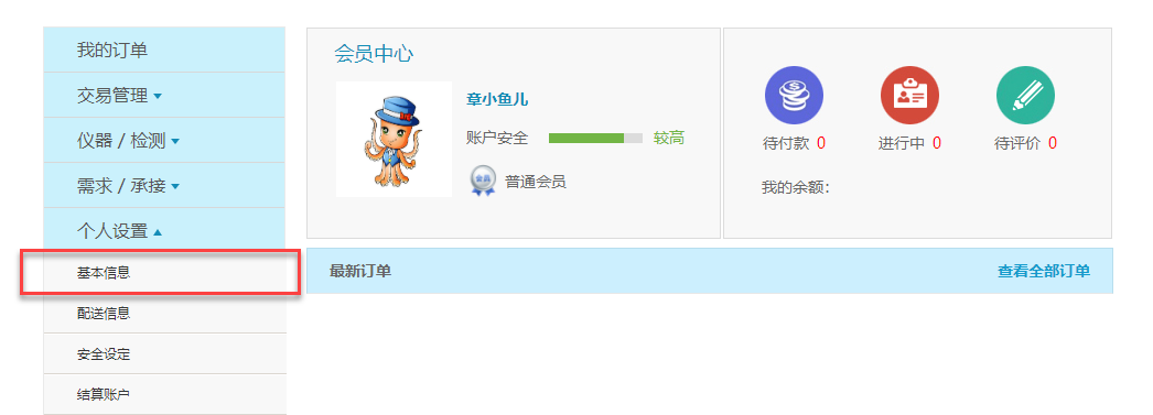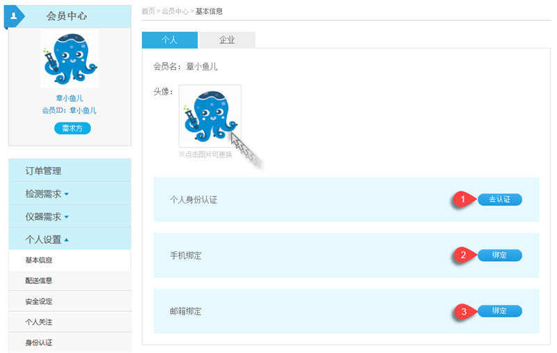 1)点击画面上方的登录状态栏进入会员中心,通过左侧菜单的 [基本信息] 即可进行会员信息的完善操作。